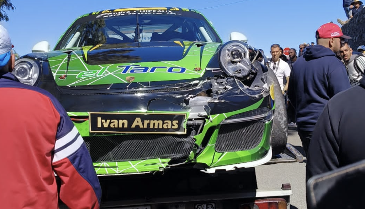 Mala suerte para el piloto grancanario Iván Armas en la manga de entrenamientos de la Subida de Tejeda, donde en su afán de dar el mayor espectáculo posible se le iba lo justo su Porsche 911 GT3 para impactar contra las vallas y no poder continuar en carrera.