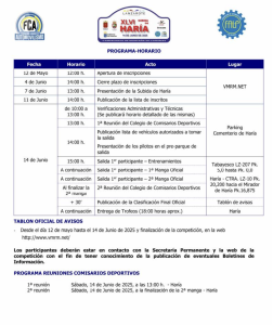 El programa de la subida será íntegro en la jornada del sábado 14 de junio, con verificaciones de los coches por la mañana (de 10 a 13 h) en el pueblo de Haría (parking del cementerio), con salida de la primera manga de reconocimientos a las 3 de la tarde. A continuación las dos oficiales y la entrega de trofeos final prevista para las 18 h en la plaza del pueblo.