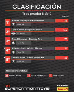 Cerrando el top 5 se encontraban Alberto Nimo, que se repuso a un repentino apagón de su vehículo que le hacía perder más de un minuto, y Jaime Castro, que continúa con su adaptación al Fabia R5. En la lista de abandonos ya figuraba Santi García, por culpa de una avería cuando rodaba cómodamente en la cuarta plaza.