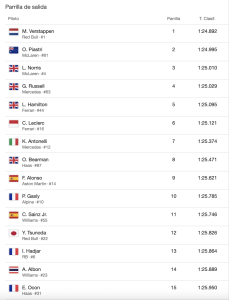 Las tres siguientes posiciones fueron ocupadas por pilotos ingleses, Lando Norris (McLaren), George Russell (Mercedes) y Lewis Hamilton (Ferrari), que saldrá desde la tercera final acomunado de su compañero de equipo, el monegasco Charles Leclerc.
