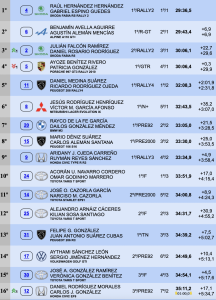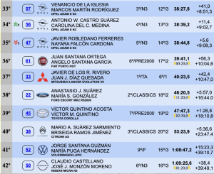 De momento se mantienen en el sexto puesto, a pesar de diversos problemas mecánicos, el MItsubishi Lancer Evo de Jesús Rodríguez-Víctor García, seguido del BMW M3 de Rayco de la Fé-Dailos González, Aridany Ojeda-Ruymán Reyes con su nuevo Honda Civic Type-R, Mario Déniz-Carlos Alemán con el Peugeot 106 S16 y Acorán Navarro-Omar Godinho con el Yaris, que cierra el «top-ten» y sigue de líder en el Trofeo Enma-2RM y de la categoría 3, con los José y Narciso Cazorla a menos de 10 segundos con su incombustible y rápido Toyota Starlet, undécimos de la general. Más o menos en el orden que finalizaron la etapa de anoche.