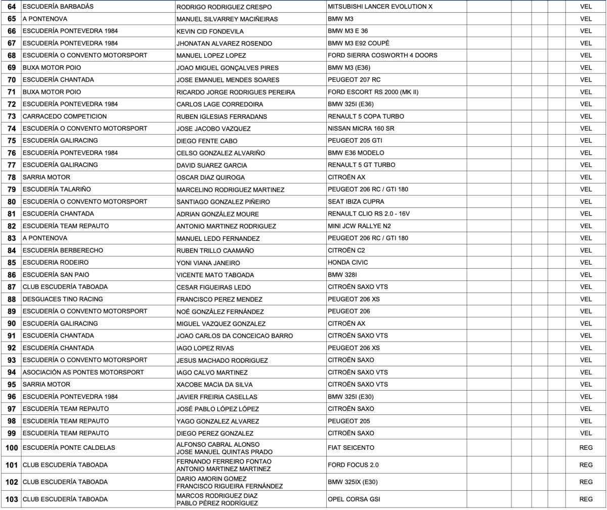 En lo referente al apartado autonómico, enclavados en el Trofeo Patatas Fritas Jaly´s, un magnífico plantel de equipos gallegos estarán presentes en la prueba. Así nombres como Pablo Rey (Norma), Antonio Pérez (Nova), Yelco Álvarez (Forwin), Pablo Vázquez (Osella) o Manuel Rey (Radical) encabezan una lista de 70 participantes entre los que destacan en carrozados Jorge Pérez (Porsche), Joao Paulo Oliveira (Audi), Antonio Casimiro (Porsche), José Silvino (Nissan) o Manuel Senra (Peugeot 308). En definitiva, una excelente lista de inscritos que a buen seguro hará disfrutar a los aficionados los próximos días 26 y 27 de julio en la ribeira chantadina, del mejor Automovilismo de montaña nacional y gallego.