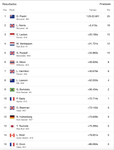 El quinto lugar fue para George Russell, de Mercedes y la mención honorífica de la carrera se la llevó Gabriel Bortoleto, que terminó noveno y puntuó por segunda vez en su temporada debut en la F1.