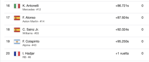 En cuanto a los españoles, Fernando Alonso (Aston Martin) acabó en la décimo séptima posición, a 87.924, seguido por Carlos Sainz Jr. (Williams), décimo octavo, a 92.024