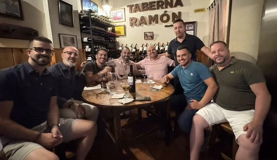 En la imagen colgada en redes sociales por la Taberna Ramón, se puede observar a los tres pilotos tinerfeños junto al veterano copiloto Mario Quintero y el piloto palmero David Perdomo, además de otros comensales.
