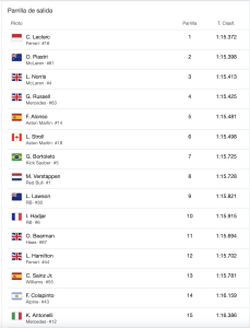 Leclerc realizó una vuelta perfecta en el momento justo y dejó sin respuesta a Oscar Piastri segundo, y Lando Norris, tercero. Los McLaren venían en vuelta lanzada cuando el Ferrari cruzó por la zona de meta y se puso primero. Pero ninguno de los dos monoplazas naranja pudo mejorar sus cronos parciales y al final no pudieron con el 1.15.372 que marcó Leclerc para llevarse la posición de privilegio.