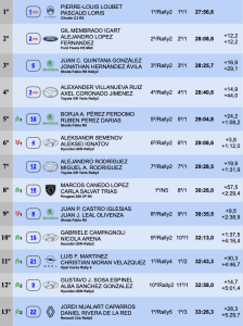 Terceros de la general se sitúa el ex campeón del CERT y líderes del Campeonato de Canarias, Juan Carlos Quintana y Jonathan Hernández (Škoda Fabia RS Rally2), que se han descolgado de la lucha por la victoria al estar ahora a 29,1 del liderato y a 16,9 del segundo lugar