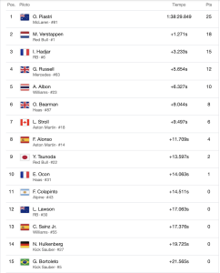George Russell sobrevivió a una dura batalla con Charles Leclerc y fue cuarto, seguido de Alex Albon de Williams. Ollie Bearman, Lance Stroll, Fernando Alonso, Yuki Tsunoda y Esteban Ocon completaron los monoplazas que terminaron en los puntos.