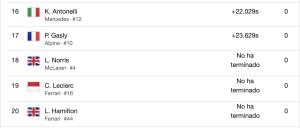 Décimo tercero acabó el español Carlos Sainz (Williams), mientras que su sustituto en Ferrari, Lewis Hamilton, abandonó.