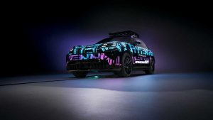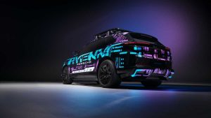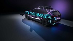En su primera aparición oficial en el Reino Unido, el Cayenne causó sensación con una llamativa pintura. El coche expuesto en el IAA de Múnich está dotado de un innovador acabado fluorescente de diseño muy similar. En cuanto fluye la electricidad, se crea una emocionante imagen de la carrocería con superficies de colores vivos, cuyo patrón de camuflaje ha sido diseñado por Style Porsche. Algunas secciones se han dejado deliberadamente sin pintar y permanecen oscuras. Cinco tonos de color, desde el azul hasta el violeta, se han aplicado de forma selectiva.