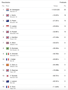 Lando Norris ocupó el segundo lugar, al no poder con el ritmo del neerlandés. En la parada en pits el equipo falló y le devolvió tercero a la pista, detrás de Oscar Piastri, pero, para enmendar su error, Andrea Stella, team principal del equipo británico, mandó a Piastri a devolverle la posición, finalizando el líder del Mundial de Fórmula Uno en tercera posición. Piastri lidera con 324 puntos, por los 293 de Norris, siendo 31 la diferencia entre ambos cuando faltan ocho Grandes Premios en el calendario.