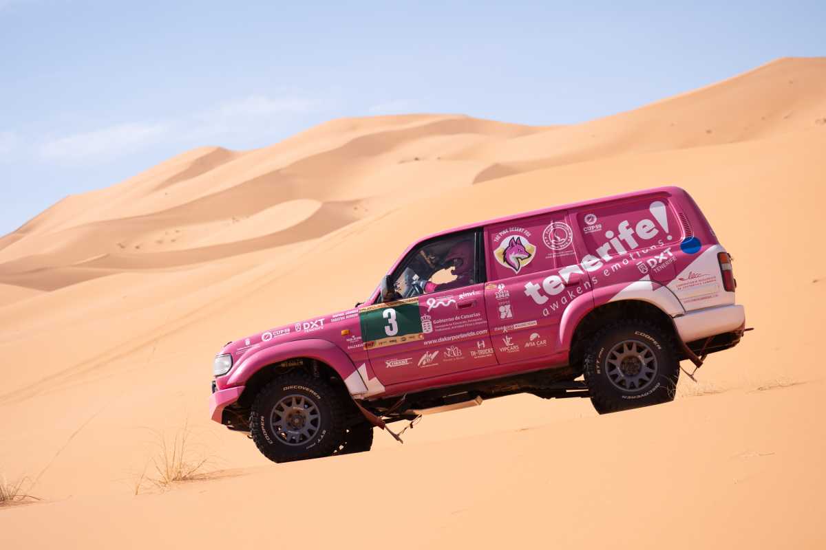 El Zorro Rosa comienza a despuntar sobre las arenas del desierto marroquí, tras sufrir el problema de desfase en los aparatos electrónicos encargados de controlar el posicionamiento real del vehículo en relación con lo que le marca la tablet en su paso por cada punto de control de su hoja de ruta.