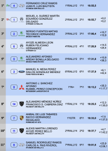 Más descolgados de los dos anteriores han finalizado el viernes Fuentes y Hernández, que son terceros a 10.9, aunque en un cómodo tercer escalón del podio al tener a Ayoze Almeida-Rubén Feliciano (Citroën C3 Rally2) a 14.5 en la cuarta plaza.