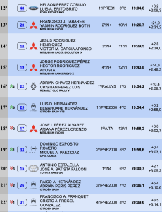 Quintos son Alejandro Afonso-Ariday Bonilla (Skoda Fabia Rally2 Evo), que están a 10.9 del cuarto puesto y a 6.1 de Manolo Mesa y Dailos González (Ford Fiesta R5 MK II), sextos.