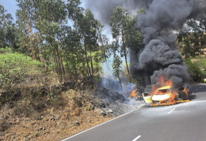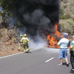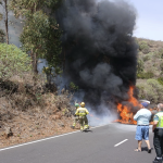 Uno de los coches de la caravana de seguridad del Rally Isla Bonita de La Palma se ha incendiado en la jornada de este sábado mientras realizaba sus funciones en la cita palmera.