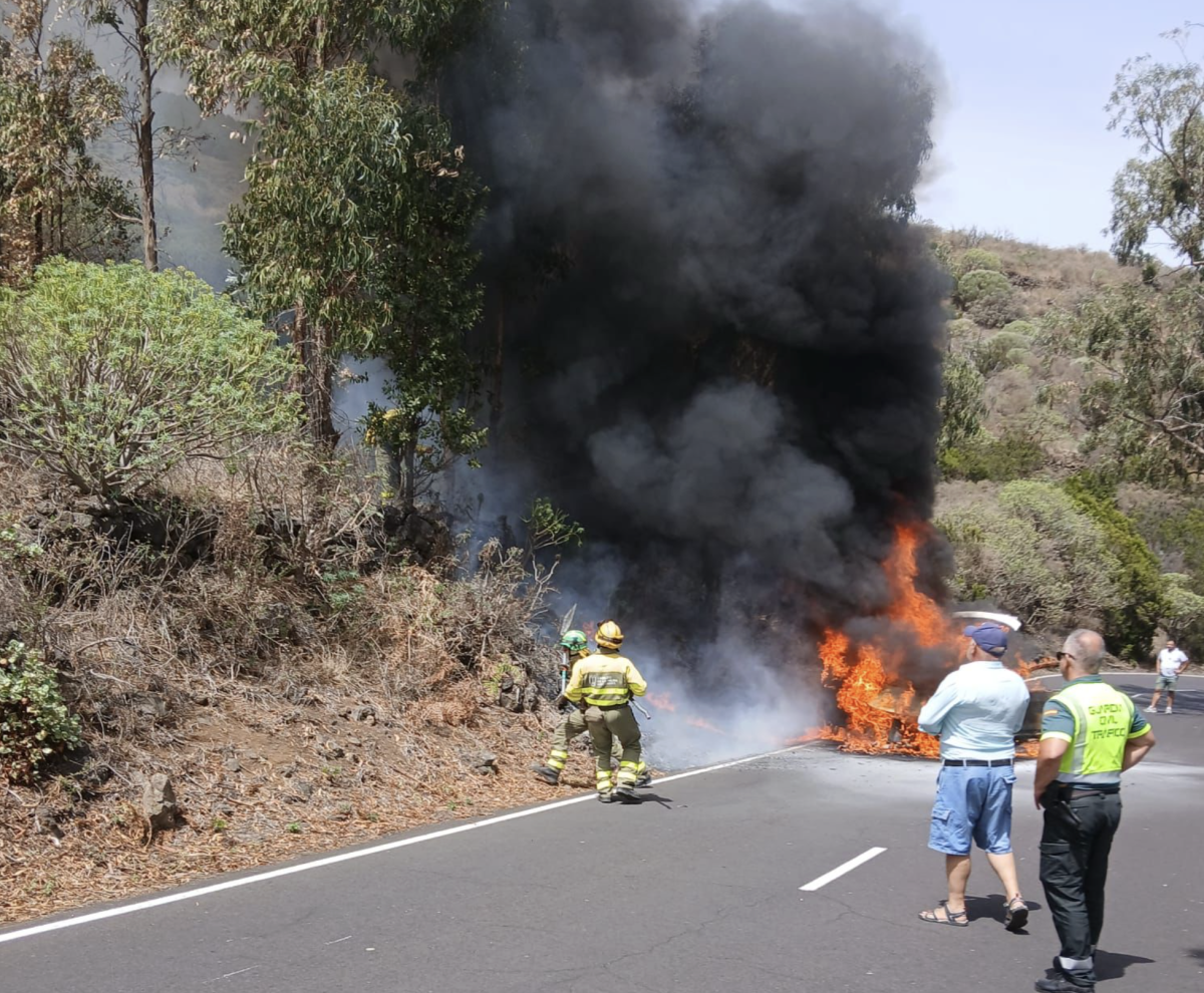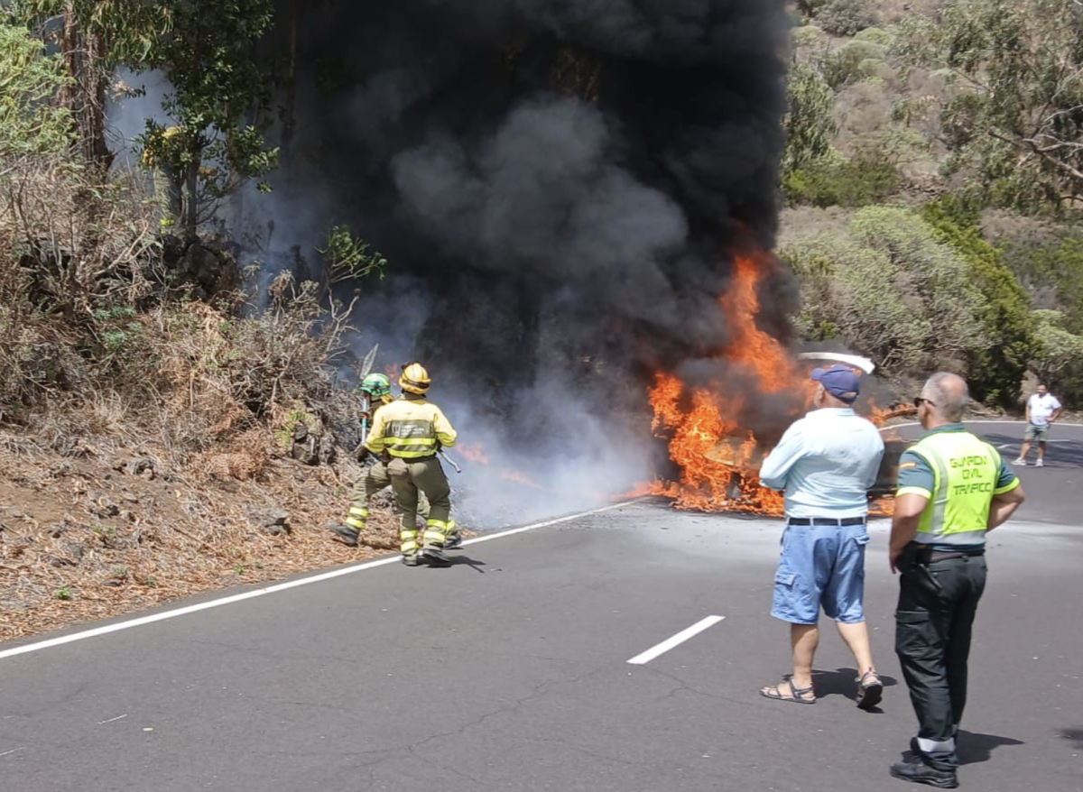 Uno de los coches de la caravana de seguridad del Rally Isla Bonita de La Palma se ha incendiado en la jornada de este sábado mientras realizaba sus funciones en la cita palmera.