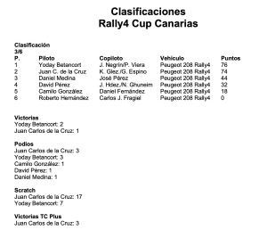 Después de visitar estas tres islas, Yoday Betancort y Pedro Viera encabezan la tabla provisional con 76 puntos, cosecha, en buena medida, fruto de sus dos últimos triunfos. Este joven piloto, un indudable valor del automovilismo canario, tiene la oportunidad de acercarse, un poco más, a su primer gran resultado.