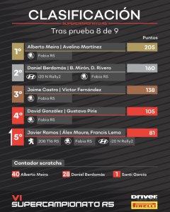 Con los dos equipos de cabeza escapándose con el paso de los kilómetros, la lucha quedaba en la tercera plaza, que se quedaba sin uno de los apostantes, Santiago Romero, antes del ecuador de la prueba. Jaime Castro ocupaba ese último peldaño del podio a mitad de jornada, pero la lluvia caída al inicio de la tarde y una mala elección de neumáticos le hacía ceder la posición con Antón Pérez en ese primer bucle vespertino. No obstante, Castro salió al ataque en la noche para remontar la desventaja de casi 19 segundos y terminar 4 por delante del piloto coruñés.