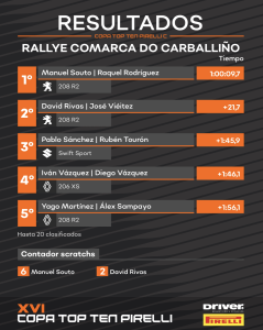 Con la llegada de la lluvia por la tarde, Manuel Souto se sintió especialmente cómodo, distanciándose de Rivas para hacerse con un nuevo triunfo en el certamen junto a su copiloto Raquel Rodríguez. Sánchez terminaba tercero precediendo a todos los Clio y sumando unos puntos vitales para depender de sí mismo en el Rallye San Froilán, donde correrá en casa y con Rivas como principal rival por el título.