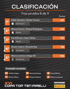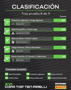 Fue entonces cuando los Iglesias, en plena remontada tras problemas con la dirección de su Fiesta N5 y un pinchazo, dieron caza a Marcos Díaz, que se encontraba en el liderato, para obtener la victoria por delante del piloto de BMW. Daniel Montoto realizaba una actuación muy regular para finalizar tercero, con el Ibiza de Diego Rodríguez en la cuarta plaza, mientras Abel Pampillón remontaba hasta el top 5, para llegar al San Froilán con un solo punto de desventaja respecto a Tino Iglesias. Por lo tanto, el que termine delante en Lugo, será campeón.