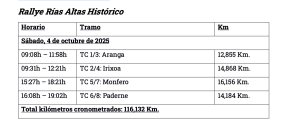 El Rallye Rías Altas Histórico reunirá a más de medio centenar de inscritos en el apartado de velocidad y se disputará íntegramente en la jornada del sábado, con cuatro tramos que se recorrerán a doble pasada. La ceremonia de salida se celebrará el viernes en el emblemático escenario de la plaza de María Pita, en A Coruña, aportando un gran ambiente previo al inicio de la competición.