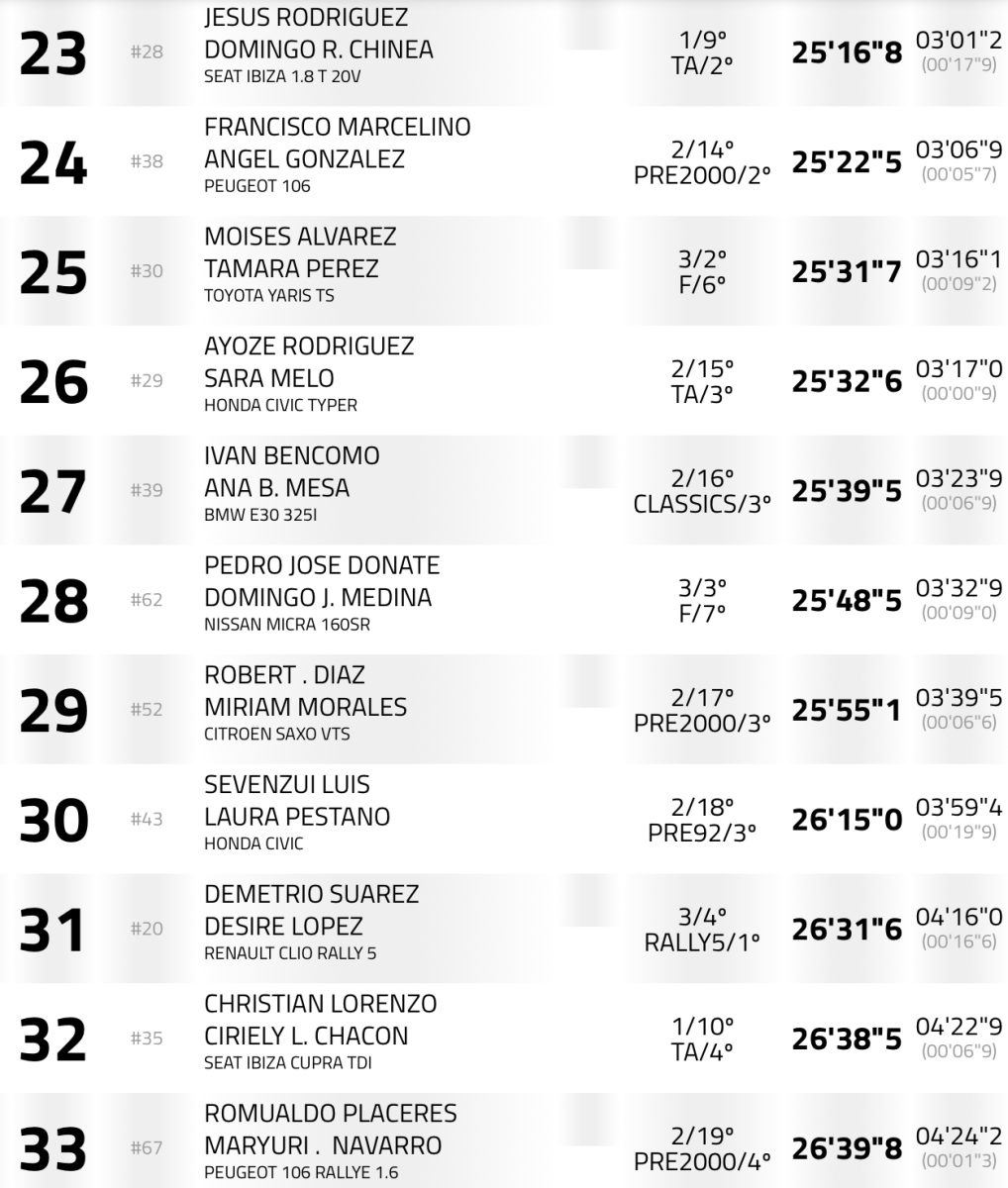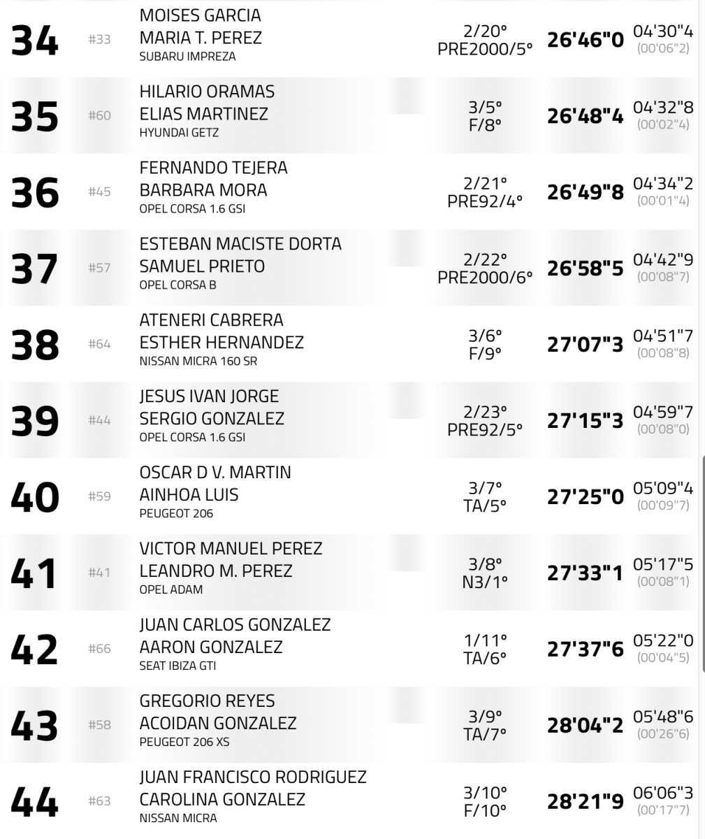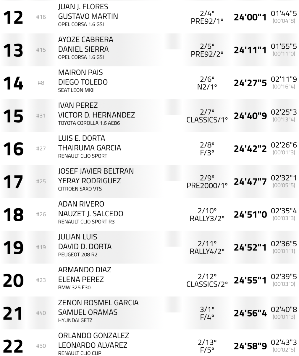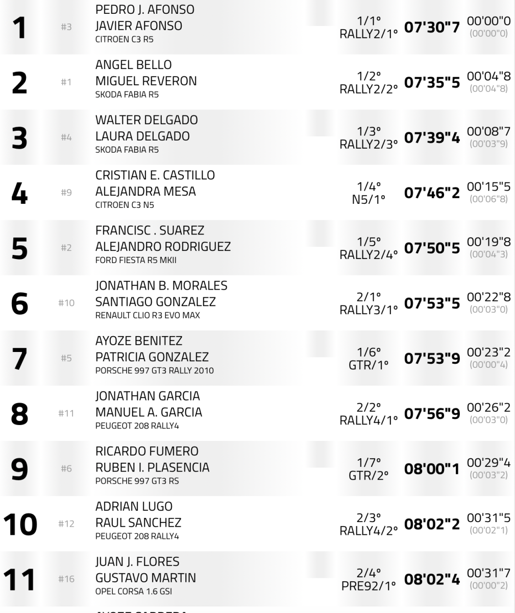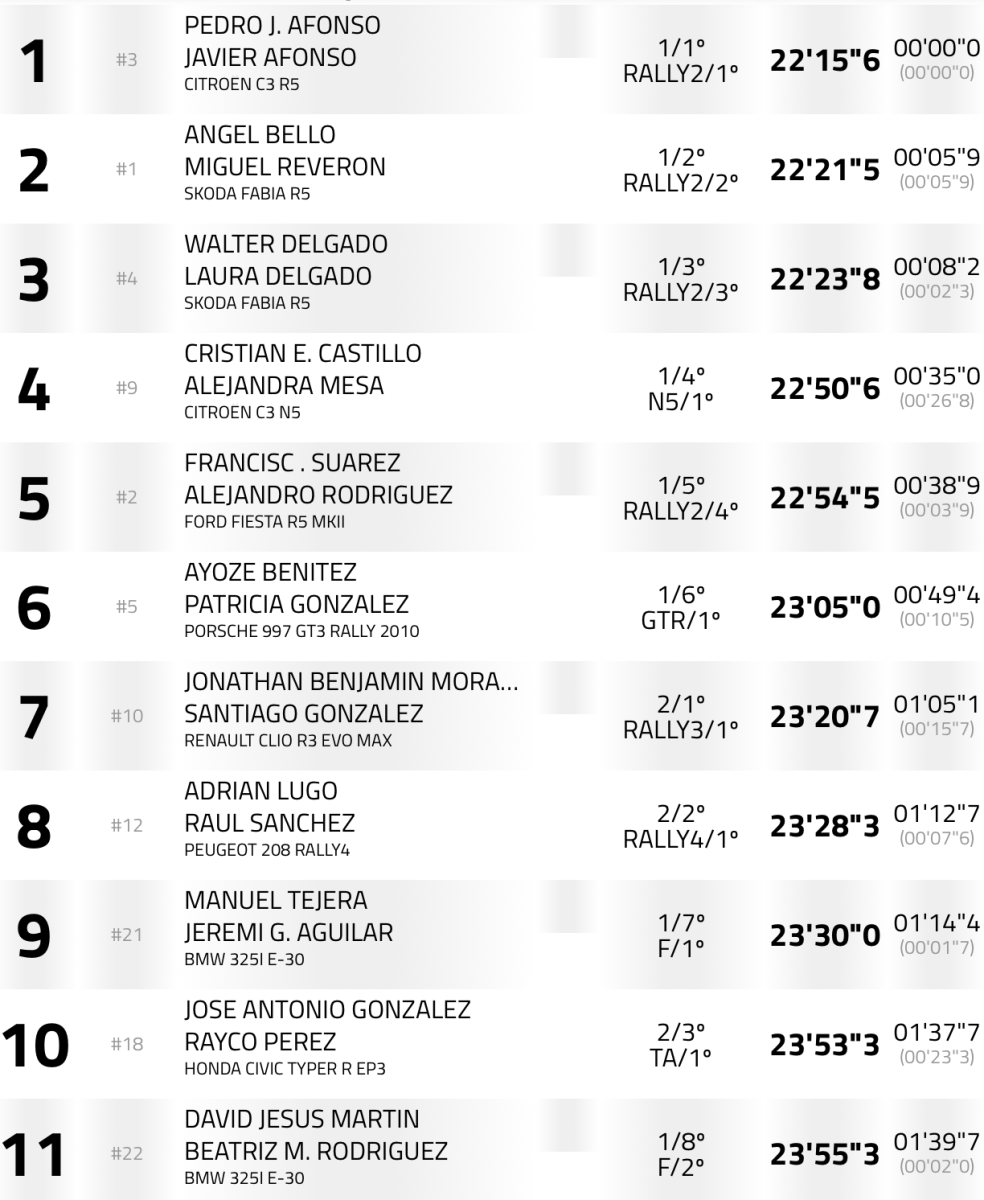 Quintos llegaron Fran Suárez-Alejandro Rodríguez (Ford Fiesta R5 MKII), a 38,9, seguidos de Ayoze Benítez- Patricia González (Porsche 997 GT3 Rally 2010), a 49.4, Jonathan Morales-Santiago González (Renault Clio R3 Max), a 01:05.1, Adrián Lugo-Raúl Sánchez (Peugeot 208 Rally4), a 1:12.7, Manuel Tejera – Jeremías Aguilar (BMW 325I E-30), a 1:14.4, cerrando el top 10 José Antonio González y Rayco Pérez (Honda Civic Type R EP 3).