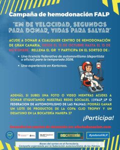La Federación de Automovilismo de Las Palmas (FALP), a través de su nueva Comisión de Responsabilidad Social, Integración y Medioambiente, lanza la campaña de hemodonación ‘KM de Velocidad: segundos para donar, vidas para salvar”. Esta acción reafirma el compromiso que el organismo regidor las competiciones de la provincia oriental está adquiriendo con la sociedad de las Islas y las diferentes realidades a la que esta se enfrenta.