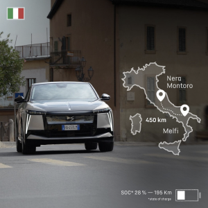 - Melfi – Nera Montoro (Italia): 450 km, estado de carga (SOC) al llegar al destino del 28 % y 195 km, lo que ilustra una gestión energética especialmente optimizada.