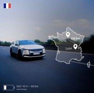 - París – Lyon (Francia): 450 km, 10 % de estado de carga (SOC) y 60 km de autonomía al final,