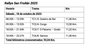 La prueba lucense arrancará este viernes con las verificaciones técnicas y la ceremonia de salida, mientras que la acción en los tramos se disputará íntegramente durante la jornada del sábado, con cuatro especiales a doble pasada para completar casi 450 kilómetros totales, de los cuales algo más de 90 serán cronometrados.