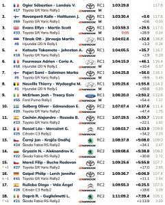 Ott Tänak se mantuvo cuarto con su Hyundai i20 N, a 1,5 segundos de Evans, mientras que Takamoto Katsuta se situó a solo 2,4 segundos en quinto lugar. Toyota ocupa ahora cuatro de los cinco primeros puestos y puede asegurar el campeonato de constructores este fin de semana si Hyundai no logra superarlo por seis puntos.