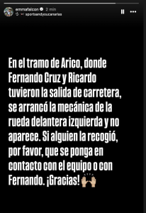 Por desgracia, algunas piezas no aparecen, y Emma Falcón, directora de Sports & You Canarias, explica en sus redes que en el golpe se arrancó la mecánica de la rueda delantera izquierda, la que no aparece, por lo que pide la colaboración de los aficionados presentes en ese tramo para hacerle llegar al equipo dicha pieza.