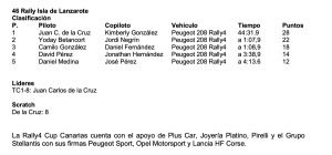 Un nuevo triunfo de esta pareja a los mandos de su Peugeot 208 Rally4 les deja en bandeja la primera edición de la Rally4 Cup Canarias, certamen al que sólo le resta el Rally de Maspalomas el próximo 1 de noviembre. Juan Carlos de la Cruz y Edu González fueron los primeros líderes, pero una salida de carretera en la segunda prueba especial del IX Rally Villa de Teguise les dejó sin opciones. Así, David Pérez y Nazer Ghuneim terminaron en la segunda posición para consolidar su plaza de podio en este certamen.