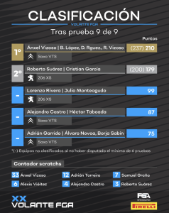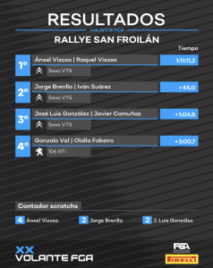 El Volante FGA puso punto final a la temporada en Lugo, con un total de cuatro participantes y el regreso del ya campeón, Ánxel Vizoso, copilotado por su hermana Raquel, que realizaba su debut en la ciudad amurallada. Frente a ellos, Jorge Brenlla, Gonzalo Val y José Luis González presentarían batalla por la última victoria del año.