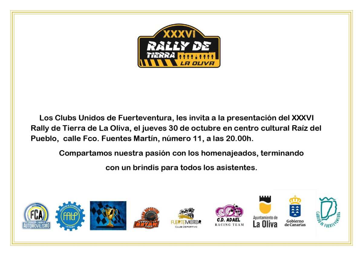 Los Clubs Unidos de Fuerteventura, en colaboración con el Ayuntamiento de La Oliva, Cabildo de Fuerteventura y las Federaciones de Canarias y provincial de Las Palmas de Automovilismo, les invitan al acto de presentación del XXXVI Rally de Tierra de La Oliva,