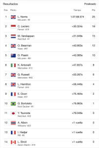 El segundo lugar de la carrera fue para el monegasco Charles Leclerc (Ferrari), que aguantó el empuje del holandés Max Verstappen, que terminó en tercer lugar. El cuarto puesto fue para el novato Oliver Bearman, que realizó una muy destacada actuación con el Haas, logrando no ser adelantado por Piastri.