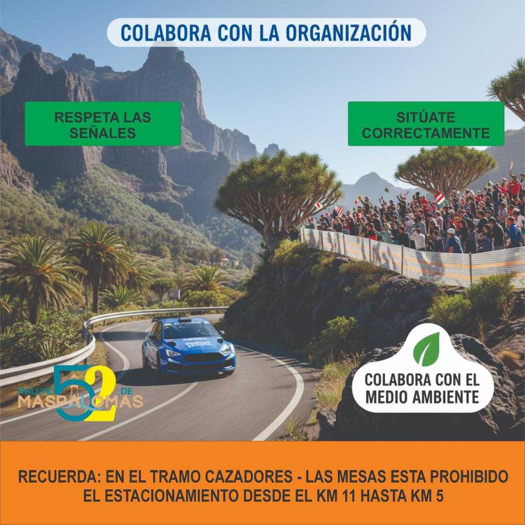 Además del deber de los aficionados de colocarse en lugares elevados y seguros, la organización de la Escudería Maspalomas recuerda también que no se deben olvidar otras prohibiciones, como la de caminar por el tramo 30 minutos antes del comienzo del mismo y el respeto al medio ambiente del entorno donde nos encontramos, ya que se no se debe alterar por culpa de nuestra presencia, no dejar rastro y menos de basuras o desperdicios. Se pide como mínimo y en lo posible, dejarlo todo igual a como lo encontramos e incluso mejorarlo.