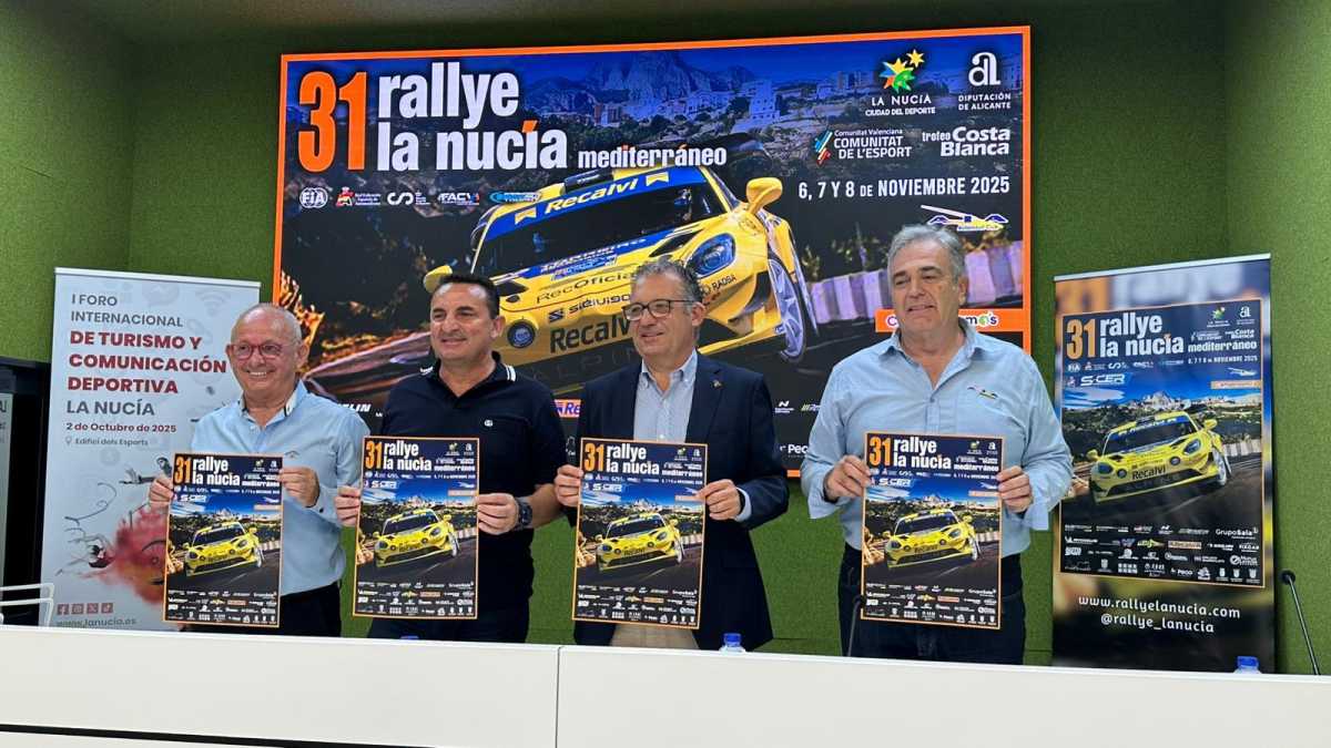 La Ceremonia de Salida se realizará desde l’Auditori de les Nits este jueves 6 de noviembre a las 20 horas, con entrada libre y gratuita. La presentación del 31o Rallye La Nucía- Trofeo Costa Blanca ha sido esta mañana en l’Edifici dels Esports y ha contado con la presencia de José Vicente Medina, vicepresidente de la Federación Española de Automovilismo, Vicente Cabanes, director del Rallye y presidente del. Automóvil Club AIA, Ángel Esteve, Jefe Seguridad Rallye y Bernabé Cano, alcalde de La Nucía.