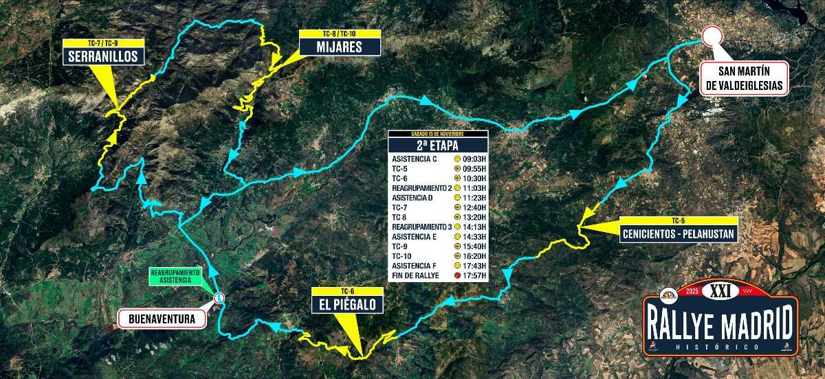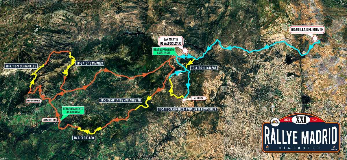 Tras la ceremonia de salida prevista para las 15:00h en el Palacio del Infante Don Luis, en Boadilla del Monte, los participantes se dirigirán a la zona de asistencia en San Martín de Valdeiglesias desde donde se iniciará la etapa compuesta por dos secciones. En cada una de ellas se hará una pasada a los tramos de ‘Almorox-Cadalso de los Vidrios’ y ‘La Bizca’.