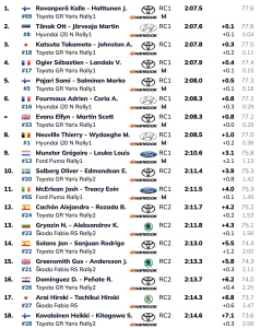Detrás del trío líder, Sébastien Ogier abrió cuarto para Toyota Gazoo Racing, a solo 0,4 segundos del punto de referencia, mientras que Sami Pajari impresionó nuevamente con el quinto lugar.
