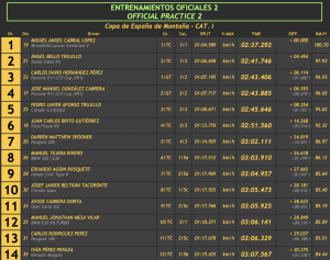 Tras la rotura de Miguel Ángel Cabral con su Mitsubishi Evo V, quien lideró las mangas de entrenamientos oficiales, Ángel Bello se posiciona como líder en la categoría 1, marcando un tiempo de *02:40.180* con su Skoda Fabia Rally2. Le siguen Juan Carlos Brito (Ford Fiesta R5) con 02:41.681 y Carlos David Hernández (Porsche 911 GT3 Cup).