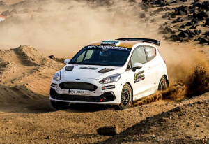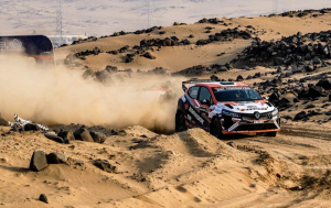 El aspirante local Saeed Almouri se mantuvo segundo durante la noche con su Renault Clio Rally3, pero perdió más de 10 minutos en la última etapa del bucle matutino al verse obligado a parar a cambiar una rueda. Aún con dolor de espalda por un fuerte impacto previo, la tarea recayó en su copiloto Ata Al-Hmoud, lo que los dejó fuera del segundo puesto.