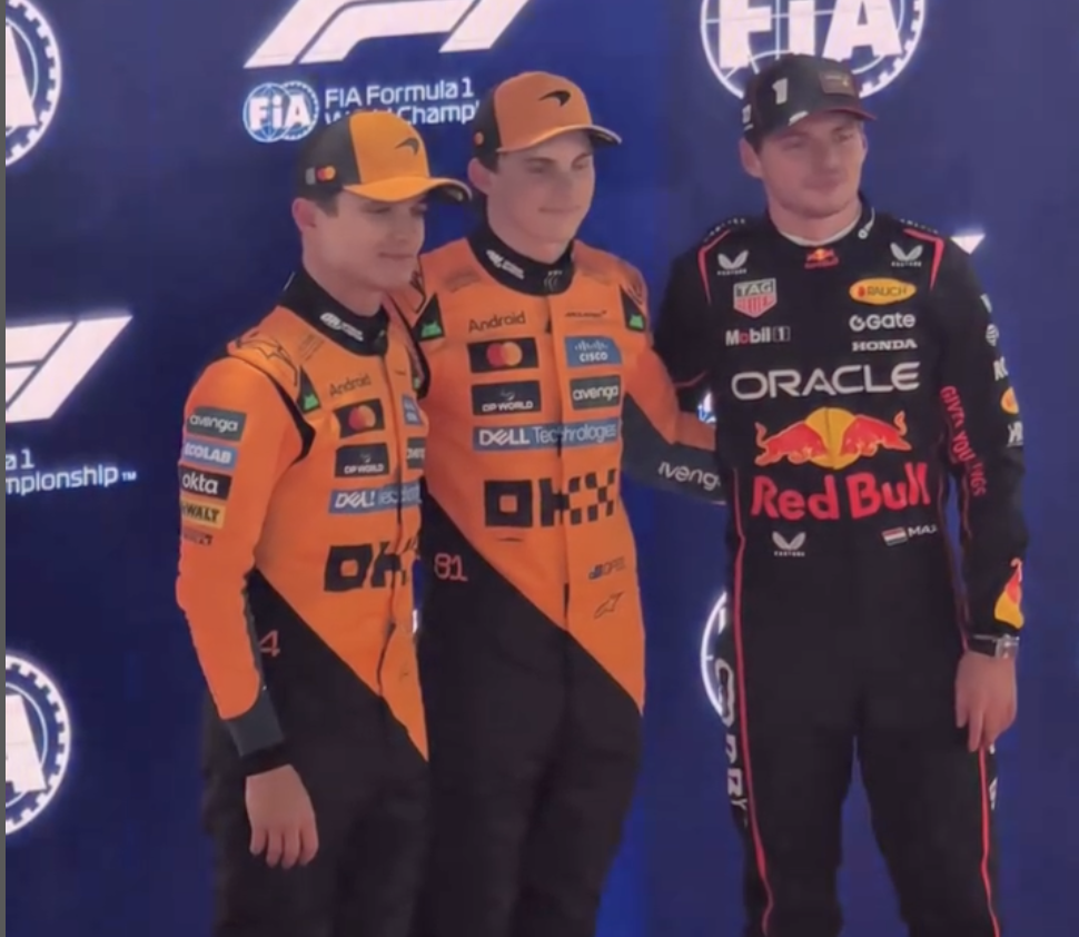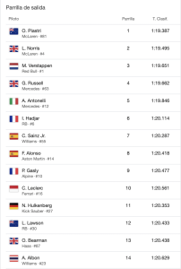 El holandés Max Verstappen, que también sigue en la lucha por el campeonato de pilotos de este año, tuvo que conformarse con el tercer puesto de la parrilla en la penúltima carrera de la temporada tras marcar un tiempo a 0.264 segundos del 1:19.387 de Piastri y a 0.156 segundos de Norris.
