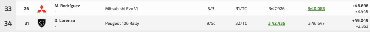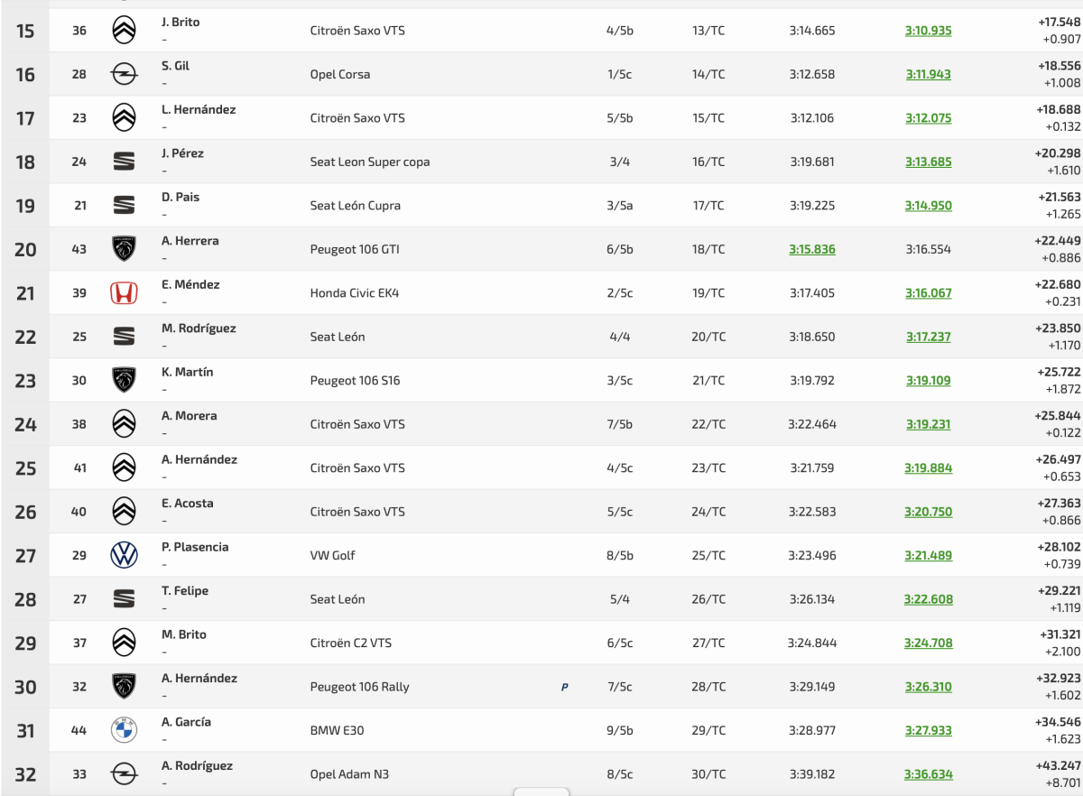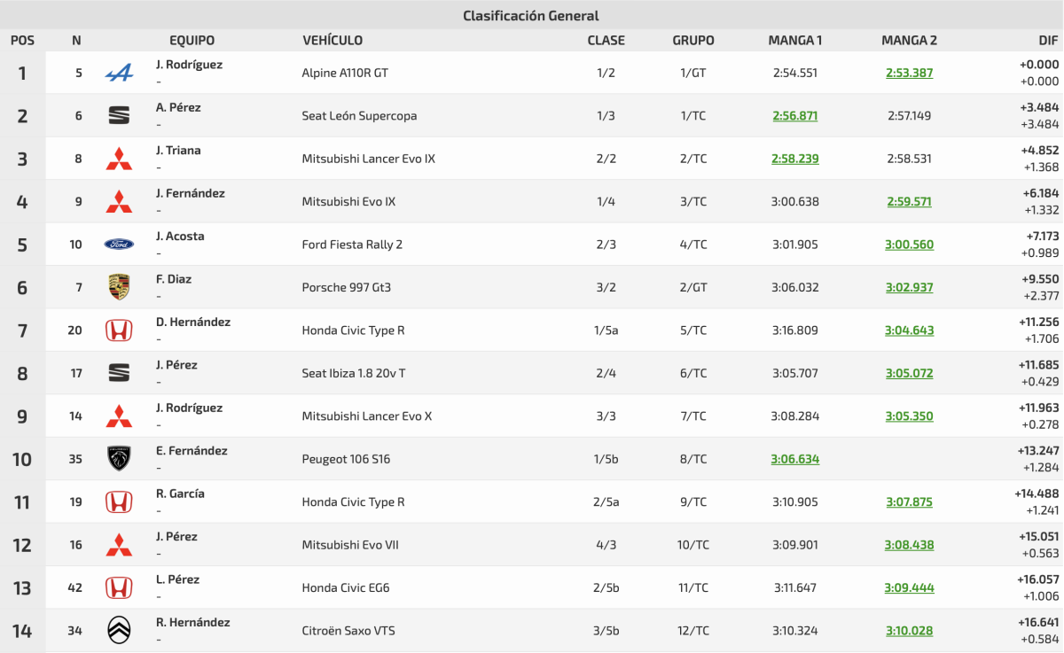 Por clases, Daniel Hernández (Honda Civic Type R) ganó la Clase 5a; Edgar Fernández (Peugeot 106 S16) hizo lo propio en la Clase 5b, mientras que Sergio Gil sobre un Opel Corsa hizo suya la Clase 5c.
