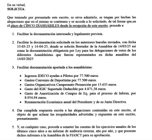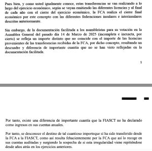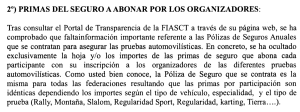 En una de la parte del escrito se dice que «tras examinar los importes del seguro de las pruebas de los últimos cuatro años y después de recabar externamente la información necesaria con varios organizadores, porque no se aporta en el Portal de Transparencia de la FIASCT, como son las pólizas de seguro a otras federaciones que si recogen los importes de las primas perfectamente especificados, así como diferentes facturas emitidas por la FIASCT a los diferentes organizadores, he tenido conocimiento a través de diversas escuderías, que a los organizadores de las diferentes pruebas automovilísticas, la FIASCT les ha facturado importes superiores a los fijados en las diferentes primas de seguro. En dicho examen se ha realizado unas estimaciones/comparación entre los importes facturados y lo que correctamente le corresponde abonar a los organizadores y se puede concluir que desde al año 2021 al 2024, lo facturado de más por parte de la FIASCT a los organizadores podría ascender a más de 75.000 euros aproximadamente».