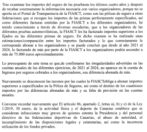 En una de la parte del escrito se dice que «tras examinar los importes del seguro de las pruebas de los últimos cuatro años y después de recabar externamente la información necesaria con varios organizadores, porque no se aporta en el Portal de Transparencia de la FIASCT, como son las pólizas de seguro a otras federaciones que si recogen los importes de las primas perfectamente especificados, así como diferentes facturas emitidas por la FIASCT a los diferentes organizadores, he tenido conocimiento a través de diversas escuderías, que a los organizadores de las diferentes pruebas automovilísticas, la FIASCT les ha facturado importes superiores a los fijados en las diferentes primas de seguro. En dicho examen se ha realizado unas estimaciones/comparación entre los importes facturados y lo que correctamente le corresponde abonar a los organizadores y se puede concluir que desde al año 2021 al 2024, lo facturado de más por parte de la FIASCT a los organizadores podría ascender a más de 75.000 euros aproximadamente».