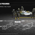 En total, las gomas han completado 67.094 vueltas, con un reparto similar entre slicks y lluvia: 64.519 vueltas con slicks y 2.578 con neumáticos de mojado (alrededor del 4%). A lo largo de todos los Grandes Premios se han realizado 720 paradas en boxes. El récord lo ostentó el Gran Premio de España, con 53 pit stops. Miami ha sido la carrera con menos, con solo 18.