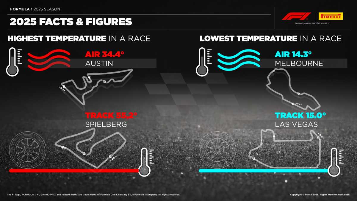 Como siempre, las temperaturas también han influido en el comportamiento de los neumáticos. La temperatura de pista más alta registrada durante una sesión fue de 58,2ºC en Yeda durante la FP2, mientras que la temperatura ambiente más elevada fue de 39,1ºC grados centígrados en Baréin durante la FP1. Las condiciones más frías se dieron en Las Vegas, con 12ºC en pista y 11,8ºC de temperatura ambiente durante la clasificación. En carrera, la temperatura máxima de la pista fue de 55,2ºC en Spielberg, mientras que la temperatura ambiente más alta fue de 34,4ºC en Texas. Los registros más bajos fueron de 15ºC en el asfalto de Las Vegas y de 14,3ºC de ambiente en Melbourne.