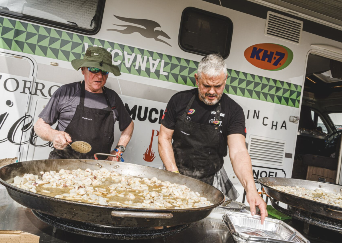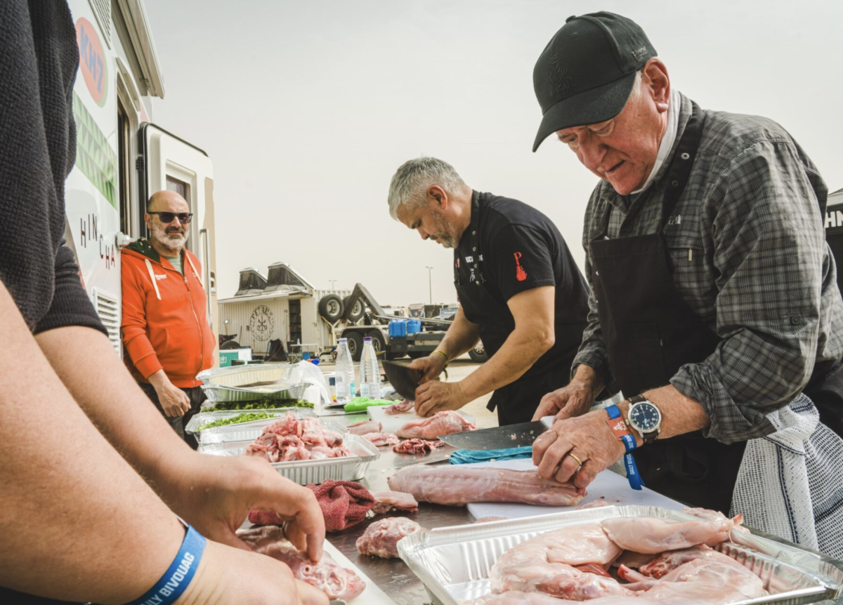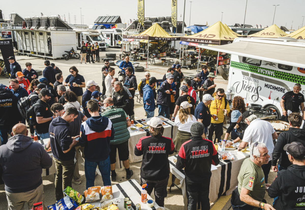 Todos los invitados que asistieron debían contribuir con aperitivos, bebidas u otros elementos, fomentando el espíritu de compañerismo tras una semana intensa con siete etapas y 3.400 kilómetros, de los cuales 2.000 han sido cronometrados. Aperitivos como olivas, frutos secos o patatas precedieron al plato principal, creando un pica-pica multicultural en el campamento.