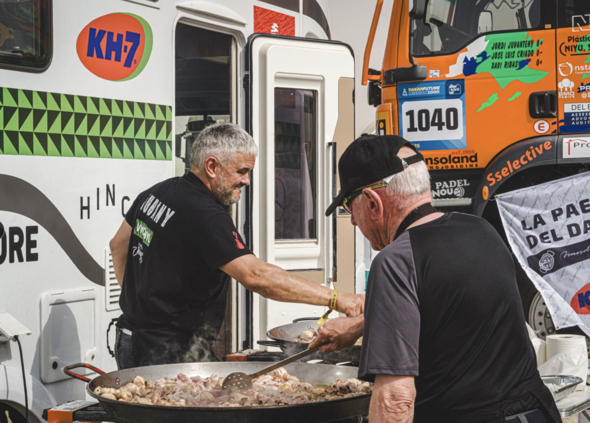 Nandu Jubany, chef con estrella Michelin y piloto en el Rally Dakar, ha preparado hoy en Riad una gran paella para más de 100 amigos y compañeros del campamento durante la etapa de descanso.